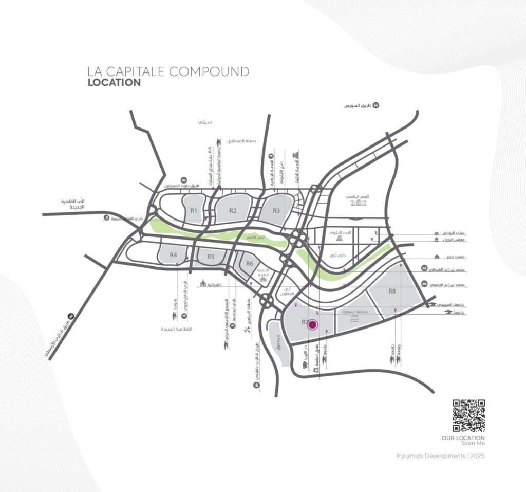في الحي السابع R7 … أمام شارع الوزراء والقصر الرئاسي مباشرة … بإطلالة على النهر الأخضر … بالقرب من الطريق الدائري الإقليمي وطريق السويس … وعلى بعد خطوات من من بوابة العاصمة الإدارية وأرض المعارض … يقابل أكبر حديقة ترفيهية في العاصمة الإدارية …
